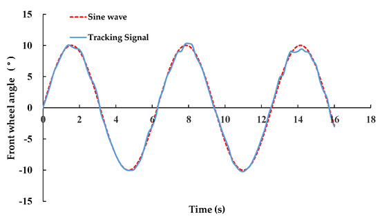 In order to test the performance of the automatic steering control system, the sine wave steering tracking test was designed. Place the test platform on the open concrete pavement, apply a sine wave signal with frequency of 0.5 πHz and an angular amplitude of 10°. Finally, record front wheel angle data. The test results are shown in Figure 4. The electric steering control system can track the control signal well, with slight oscillation near the peak ±10°, the large tracking error was 0.86° and the average absolute tracking error was 0.304°, indicating that the automatic steering control system has better performance.