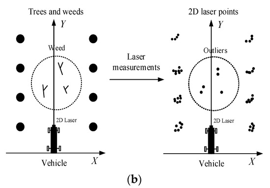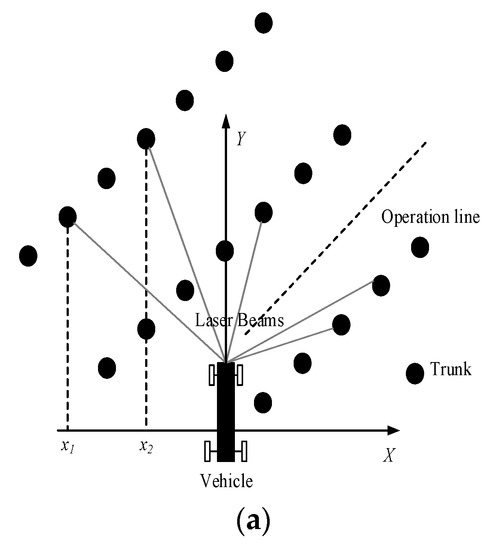 As shown in Figure 6a, when the heading direction of the vehicle differs greatly from the navigation path, the laser beam can obtain the fruit tree information at a long distance through the spacing of the plant spacing between the fruit trees, thereby causing interference to obtain effective information. We set the i-th data point to qi. Its eigenvector is shown in Equation (2). Set the distance thresholds to ρmax and xmax. If ρi < ρmax and xi < xmax, qi is retained. Otherwise it is eliminated.