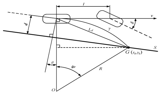 As show in the Figure 11, a pure pursuit model under the line tracking condition is established. According to the geometric relationship in Figure 11, the vehicle’s turning curve γ and the target’s abscissa xg in the car body coordinate system can be obtained: