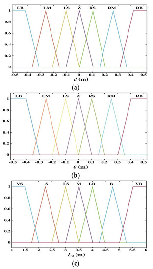According to the positional relationship between the orchard intelligent vehicle and the orchard navigation center line, the lateral deviation d and the heading deviation θ are divided into seven levels: left big (LB), left medium (LM), left small (LS), zero (ZO), right small (RS), right medium (RM), right big (RB). The forward-looking distance Ld is divided into seven levels: very small (VS), small (S), little small (LS), medium (M), little big (LB), big (B), very big (VB). Then, the distribution of this fuzzy variable membership function can be seen in the following Figure 12.