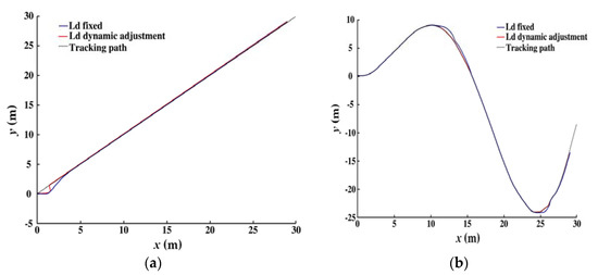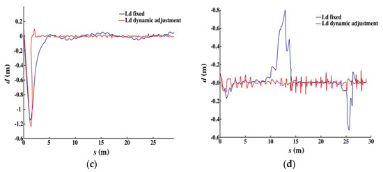 It can be seen from Figure 15c that there was a large tracking error in the linear path-tracking in the initial distance. We found that this was because the model sets the initial deviation. After the experiment was adjusted by the controller, when the vehicle was running to about 5.4 m, the pure tracking controller with fixed front view distance reached the basic steady state, and the steady-state average tracking error was 0.089 m. When the vehicle was running to 2.5 m, the adaptive pure tracking controller can achieve steady state, and the steady-state average tracking error was 0.054 m. Therefore, the adaptive pure tracking controller designed in this paper has faster response speed and higher tracking accuracy. It can be seen from Figure 15d that the adaptive pure tracking controller designed in the section with large curvature has better stability than the pure tracking controller with fixed forward-looking distance.