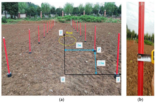 In order to test the reliability of the system, this paper build a simulation experimental environment in the experimental field of the Northwest A & F University (108°4′30″ E, 34°17′28″ N). And three experiments had been carried out successively which involved navigation path fitting, parameter acquisition accuracy test, vehicle trajectory tracking test. The simulated orchards were arranged in two rows with a spacing of 2.5 m and a row spacing of 4 m, and PVC plastic pipes with a length of 1.2 m were selected to simulate the trunk. The layout of the simulated test scene was similar to the real orchard environment in terms of soil environment, trunk characteristics and trunk arrangement. As shown in Figure 16a, the absolute coordinate system XOY was established with the tree P as a reference, 2 m to the left and 2.5 m to the rear as the origin O. In Figure 16b, the circumference of the simulated fruit tree trunk was measured with a tape measure at the same height as the 2D laser, and the diameter of the tree was obtained to be 0.04 m. The test platform was the hardware system described in Section 2.1.