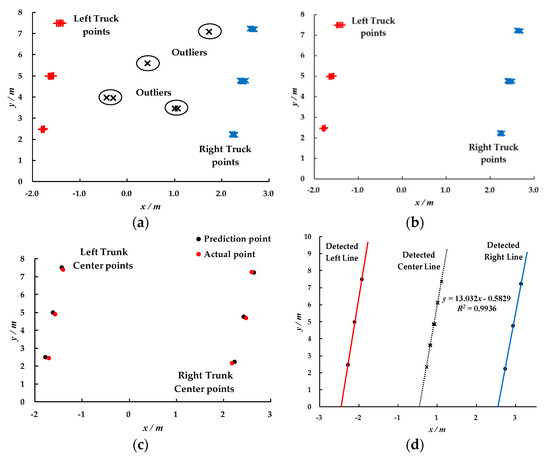 We placed the test platform statically to capture 2D laser point data at the center of the simulated orchard environment. We placed tree branches as noise disturbance in the driving area of the test platform. The method of fruit tree position information determination in Section 2.2 was used to process the laser point cloud data. According to the actual simulated environmental parameters, take the left and right three fruit trees as the target, set the distance threshold ρmax = 10 m, xmax = 2.5 m, the number of adjacent points k = 5. The laser point cloud figure after distance threshold processing was shown in Figure 17a; the laser point cloud figure after filter processing was shown in Figure 17b. As shown in Figure 17c, the red points were actual points of trunk, the black points were prediction points of trunk. The method of Section 2.3 was used to fit navigation path and obtain navigation control parameter, as show in Figure 17d.