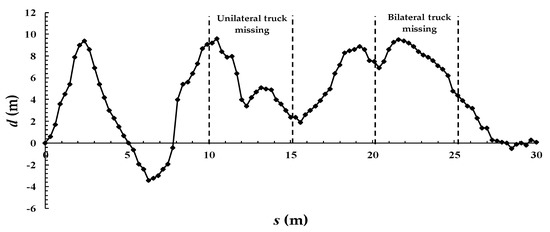 The test platform was automatically driven at a speed of 0.45 m/s, the test distance was 30 m and the measurement was carried out at intervals of 30 cm. The test was carried out in 5 groups; the test section of the unilateral fruit tree was missing at a driving distance of 10 m–15 m. At 20 m–25 m, the test section of the bilateral fruit trees was missing. The results after each test were shown in Table 5; the average tracking deviation of the test is shown in Figure 18.