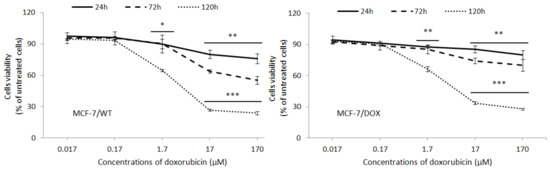 The results of the 3(4,5-dimethylthiazol-2-yl)-2,5-diphenyltetrazolium bromide (MTT) assay following cytotoxicity tests with doxorubicin (DOX) at a range of 0.017–170 μM concentration on human breast adenocarcinoma cell lines sensitive (MCF-7/WT) and resistant to doxorubicin (MCF-7/DOX). After being incubated for 10 min with DOX, cells were incubated in complete culture medium 24, 72 and 120 h. Statistically significant differences between DOX-treated cells and nontreated control (* p ≤ 0.05; ** p ≤ 0.005; *** p ≤ 0.001).