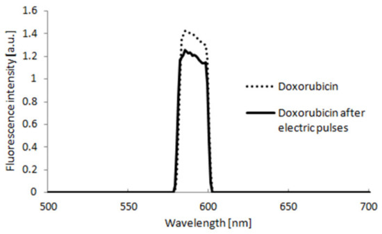 Fluorescence intensity of doxorubicin solutions without and after application of electrical pulses.