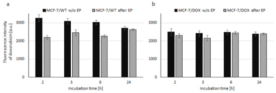 The relative fluorescence of the DOX solutions with and without the application of the electric pulse indicate a statistically significant difference between the cell lines (Figure 5). Interestingly, it was observed that MCF-7/WT cells were losing the doxorubicin fluorescent signal after electroporation. The effect of EP was not so apparent for MCF-7/DOX cells. According to Figure 5b, EP had no statistically significant impact on doxorubicin fluorescence in resistant cells. Considering the time-dependence of DOX efflux, it could be observed that the statistical differences occur only in shorter (2, 3, 6 h) incubation times and the differences diminish after 24 h of incubation. Electroporated MCF-7/DOX did not differ statistically from the control cells. However, electroporated MCF-7/WT cells released less DOX to the solution.