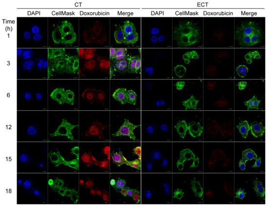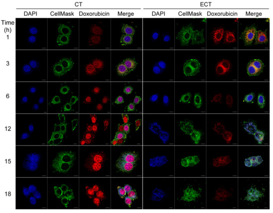 Intracellular distribution of doxorubicin (DOX = 1.7 µM) in MCF-7/DOX cells treated with chemotherapy only (CT) or electropermeabilized with DOX (ECT, EP-DOX) (EP = 1000 V/cm, 100 µs, 8 pulses, 1 Hz) after different incubation times. Scale bar = 10 μm.