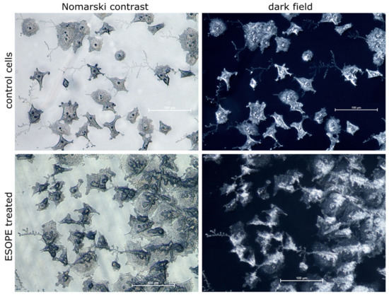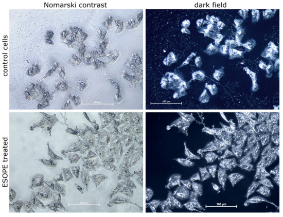In this research features of Nomarski contrast and the dark field observation (Figure 8 MCF-7/WT, Figure 9 MCF-7/DOX) were used. Nomarski contrast provides the incident light phase detection based on the interference phenomena. The resulting image can reveal the difference between two closely spaced points. The image has the appearance of a three-dimensional object under very oblique illumination, causing strong light and dark shadows. This type of microscopy that can capture images of transparent objects without the need for chemical staining are of a significant importance. A key feature is the use of a long focal length and non-contact metallurgical objectives which avoid the need for coverslips. The morphological changes manifested by the irregular shape of the cells (bulges) were observed for both cell lines within 24 h after electroporation, consistent with prior research. Cells exposed to electroporation were more flattened than the not treated samples, in particular the nucleus, and this resulted in significant alternations of cell morphology.