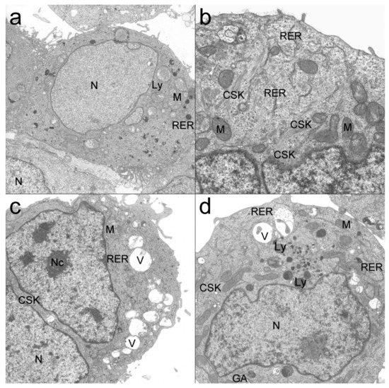 Ultrastructure of breast adenocarcinoma doxorubicin-sensitive cells (MCF-7/WT). (a)—Control, nontreated cells; (b)—Cells after exposure to doxorubicin (DOX = 1.7 µM); (c)—Cells after EP (EP = 1000 V/cm, 100 µs, 8 pulses, 1 Hz); (d)—Cells after ECT with doxorubicin. Abbreviations: CSK—cytoskeleton; GA—Golgi apparatus; Ly—lysosomes; M—mitochondria; N—nucleus; Nc—nucleolus; RER—rough endoplasmic reticulum; V—vacuole; (original magnification 7A × 4400; 7B × 12600; 7C, 7D × 7000).
