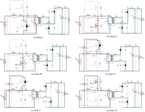 At steady state, the operation of the proposed circuit can be divided into seven modes according to the conducting status of the semiconductor devices in one high-frequency switching cycle. These operation modes and the theoretical voltage and current waveforms of the key components are shown in Figure 2 and Figure 3, respectively. For simplifying the circuit analysis, the low-pass filter and the diode rectifier at the input side are represented by the rectified voltage vrec, and the LED string is represented by its equivalent resistance RLED. The detailed description of each operation mode is as follows.