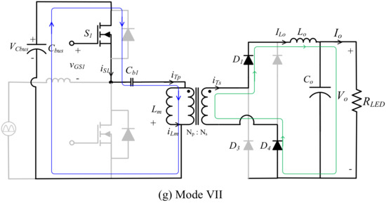 In Figure 2g, the trigger signal vGS1 remains at a high state. The dc-link capacitor Cbus keeps supplying energy via the transformer to the output. At the instant when vGS1 turns into a low state, this mode ends and the circuit operation enters Mode I of the next high-frequency cycle.