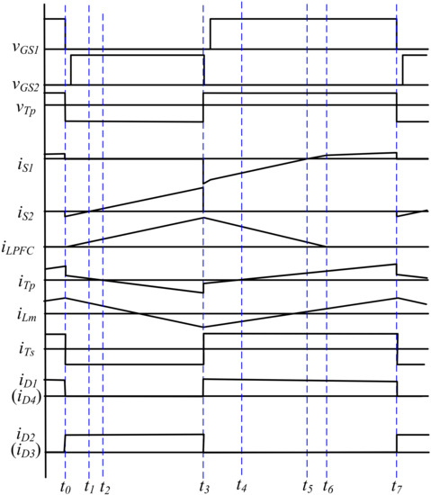 where Vm and fL represent the amplitude and frequency of the input line voltage, respectively. After a very short deadtime, the gate signal vGS2 turns from a low level to a high level in this mode. Based on Equations (1)–(3), iTp decreases. On the contrary, iLPFC increases. The mode ends at the time when iLPFC becomes higher than iTp.