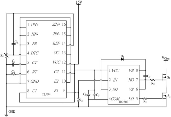 Figure 5 shows the dimming control circuit that mainly consists of a pulse-width-modulation controller (TL494) and a half-bridge driver (IR2302). The TL494 outputs a square-wave voltage of which the oscillation frequency is determined by the capacitor (C2) connected to pin 5 and the resistor connected to pin 5 (R2), and the pulse width is determined by the voltage at pin 4. The output of TL494 is connected to pin 2 of the IR2320. The IR2320 features a high-pulse current buffer stage designed for minimum driver cross-conduction. It outputs two complementary square-wave voltages (HO and LO) used to drive the high and low side MOSFETs (S1 and S2), respectively. The high-side gate driver (HO) is in phase with the logic input (pin 2). Therefore, by varying the resistor R1 to adjust the pulse width of the TL494 output (E1), ASPWM control is achieved with respect to dimming the LEDs.