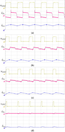 Waveforms of vGS2, iTs, and iLo at (a) 100%, (b) 50%, (c) 25%, and (d) 4% rated power. (vGS2: 10 V/div, iTs: 2 A/div, iLo: 1 A/div, Time: 10 μs/div).