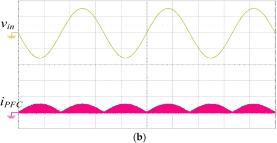 Waveforms of the input voltage and PFC inductor current. (a) 100% and (b) 4% rated power. (vin: 100 V/div, iPFC: 1 A/div, Time: 5 ms/div).