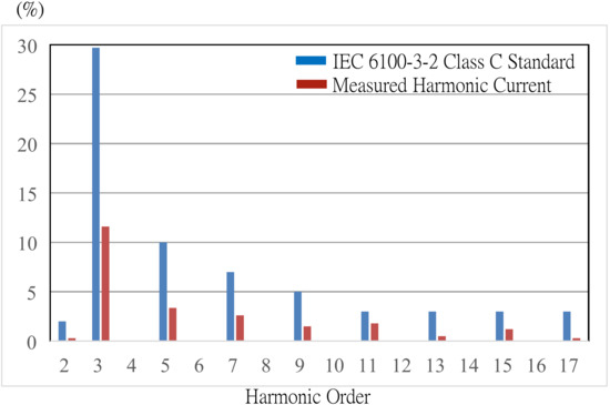 The LEDs are dimmed from 100% to 4% rated power. Figure 8 shows the waveforms of the gate voltage of S2, the transformer secondary winding current, and the output filter inductor current at different output powers. It can be seen that the LED power is controlled by varying the duty ratio of S2. From (15), for a given PFC inductor, the output power is proportional to the square of the duty ratio. As seen in Figure 7 and Figure 8, there are negative and positive spike currents in the transformer secondary winding and the diodes on its secondary side. In addition, the negative and positive spike currents happen simultaneously. The spike current is the reverse recovery current of the diode. It is seen that the negative spike current happens when a pair of diodes are turned off, and this spike current flows through the transformer secondary winding and the other pair of diodes. Therefore, the positive spike current can be seen in the secondary winding and the other pair of diodes. Figure 9 shows the measured waveforms of the input voltage and PFC inductor current under heavy and light loads. Regardless of a heavy or light load, the peak values of PFC inductor currents always follow the track of the input voltage. Also, the PFC inductor is energized and de-energized at a very high frequency which is hundreds of multiples higher than the input-line frequency. Additionally, the PFC inductor currents coincide well with the input voltage at zero-crossing points, thus warranting the active power-factor correction of the proposed circuit. The measured power factor at different output powers is illustrated in Figure 10. At rated output power (Po = 115 W), the power factor is as high as 0.99. The power factor decreases as the output power decreases the power factor decreases to about 0.92 at 4% rated power. Figure 11 shows the harmonic spectrum of the input line current at the rated power operation. It can be seen that all harmonics are in compliance with the IEC 61000-3-2 Class C standard. The measured THDi is 12.64%. Figure 12 shows the prototype of the proposed LED driver.