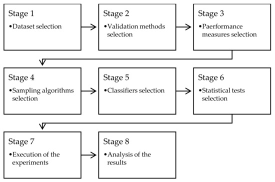 It is possible to find several state-of-the-art articles [48,49,50,51,52] in which the preprocessing of datasets is employed to reduce the impact caused by the distribution of classes. In such research, it has been empirically demonstrated that the application of a preprocessing stage to balance the distribution of classes is usually a useful solution to improve the quality of the identification of new instances. Data preprocessing techniques for imbalanced data can be divided into three groups: