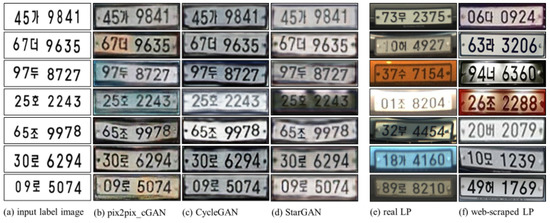 In this study, LP images were generated using the three state-of-the-art GAN-based image-to-image translation models mentioned earlier. Moreover, it was verified through experiments that the generated LP images are similar to real ones and that they were sufficient for use as training data for the LPCR.