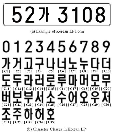Currently, LP characters in Korea are composed of seven black characters on a white background, as shown in Figure 2a. The first two digits are the car-code for the type of vehicle, and the third Korean character is the use-code specifying the use of the vehicle. The last four digits are the serial number. Figure 2b shows the character classes present in Korean LP. Numbers are defined as 10 classes from 0 to 9, and Korean characters are defined as 35 classes. In this study, an ID of C1 to C35 was assigned to each of the 35 Korean characters for convenience of expression.