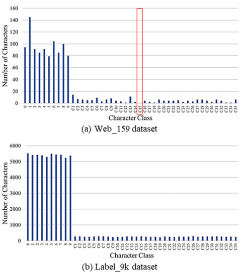 As mentioned in the introduction, consider a situation that there is a small set of real LP images. By searching for ’license plate’ through websites such as Google and SNS, we were able to scrape over 5,000 related images, out of which only 159 LP images were actually available. In the collected 159 LP image dataset (Web_159), there are 954 numbers and 159 Korean characters. Figure 3a shows the character class distribution of the Web_159 dataset. As shown in Figure 3a, there the C15 Korean character class is not present in the Web_159 dataset, there was only one incidence each of classes C12, C18, C33, and C34.