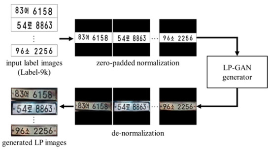 For generating the LP images using the LP-GAN generator after training had been completed, 9000 input label images were made in which each LP character had a uniformly random distribution to create the Label_9k dataset. Figure 3b shows the character class distribution in the Label_9k dataset, in which all of them are distributed uniformly, including the C15 character class which is non-existent in the Web_159 dataset. Figure 5 shows the process of generating the 9000 LP by 9000 input label image pairs using LP-GAN. After the input label images of the Label_9k dataset had been converted to zero-padded normalized images, the latter were input into the LP-GAN generator, after which the output images were de-normalized to generate the final LP images.