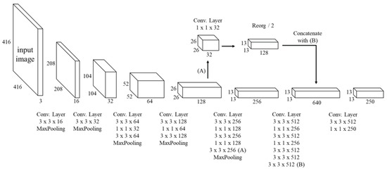 In practical ALPR systems, it is necessary to minimize the processing time and the size of required GPU memory in the LPCR stage, because the system must carry out other important processes such as acquiring images, storing recognition results, and communicating with a remote server. In addition, when considering the cost, a system with a powerful but expensive GPU processor may not always be available to run on the ALPR system, so the architecture needs to be as cost-effective and lightweight as possible. To improve these problems, we propose a modified YOLOv2 model with half of the CNN-layer filters in the YOLOv2 detector architecture proposed by Redmon et al. [48] as the LPCR method. The architecture and structure of the proposed LPCR module (i.e., modified YOLOv2) is given in Table 2 and Figure 6, respectively. The modified YOLOv2 model outputs a 13 × 13 × 512 feature map from a 416 × 416 pixel 3-channel image through five steps of convolutional and maxpool layers (Figure 6B). Next, the 26 × 26 × 256 feature map layers pass through and are reshaped into 13 × 13 × 128 feature map layers, as shown in Figure 6A, and become 13 × 13 × 640 feature map layers by concatenation with the output from Figure 6B. In the last step, 13 × 13 × 250 layers are output for the location and classification of the 45 character classes that is needed to detect (i.e., the prediction of 5 boxes with 5 coordinates each and 45 classes per box = 5 × (5 + 45)). If sufficient amount of training data were provided, the proposed YOLOv2 detector as a segmentation-free end-to-end LPCR method could achieve high performance for detecting 10 number classes and 35 character classes, which was experimentally confirmed.