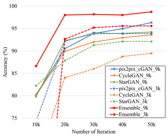 As the last thing to focus on, the overall recognition performance with the Ensemble_3k dataset was 95.56%, which is lower than 96.33% for pix2pix_cGAN_9k but higher than 93.59% for CycleGAN_9k and 94.23% for StarGAN_9k. Despite the number of training data items being three times higher, higher recognition performance was achieved when training with the 3000 training data items combining the LP images generated from multiple LP-GANs than training with a total of 9000 training data items generated from the single LP-GANs. The overall recognition performance was 98.72% for the Ensemble_9k dataset with the 9000 combined data items, which is almost the same as when trained with real images. This shows that higher performance LPCR modules can be trained with LP images generated by multiple LP-GAN generators. Moreover, it is shown that the proposed LP-GAN can be fully used as a training data generator for the LPCR module of an ALPR system. Figure 7 shows the performance comparison of the ensemble datasets and the other single datasets.
