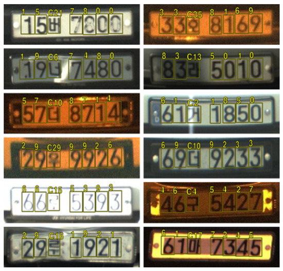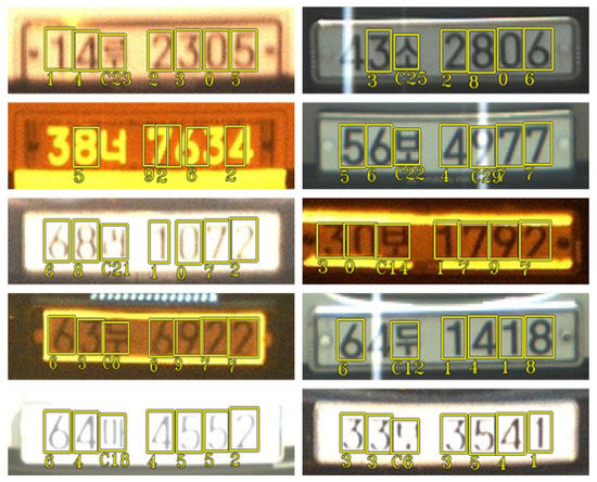 Figure 8 shows the results of the LPCR with the modified YOLOv2 model. It is difficult for LPCR using traditional segmentation-based ALPR methods to recognize the LP images because the performance was insufficient during the LP character segmentation stage due to distortion, contamination, illumination, and noise. However, since the modified YOLOv2 model detects the LP characters end-to-end without LP character segmentation (i.e., segmentation-free), its LPCR performance on the LP images was sufficient. Nevertheless, LPCR could not recognize the LP character information for some other LP images. Figure 9 shows some failure recognition resultants by the proposed YOLOv2 model. Although the proposed YOLOv2 model is robust to various environmental weaknesses, if the LP image is severely distorted due to excessive blurring or artificial manipulation, LPCR performance is degraded.