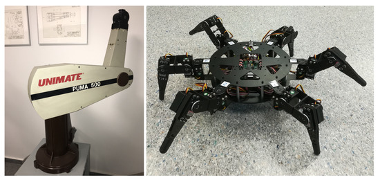 The two robotic systems that were studied in this project are a Unimate’s PUMA 560 robotic arm (Danbury, CT, USA) and the walking hexapod robot BH3-R, built and distributed by Lynxmotion Inc. (Swanton, Vermont, USA). Both robots, shown in Figure 2, are non-redundant open-chain robotic systems, and they will be used as test benches for the procedure developed in this work.