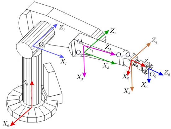 For simplicity reasons, we will focus only on the first three links of the robotic arm, just before the robot’s wrist. This simplification is valid because the last three links of the arm comply with the conditions of Pieper’s Theorem [3,8], effectively conforming an in-line wrist. Therefore, the end effector of this robot will be considered to be at the anchor point of this in-line wrist, just at coordinate system number 4, shown in Figure 3.