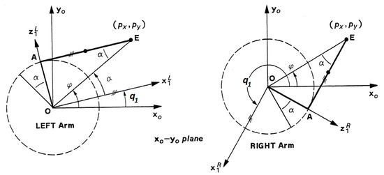 If the position vector is projected onto the plane, as shown in Figure 4, could be obtained solving the equations shown in Equation (3). The “L” and “R” superscripts added to differentiate between the LEFT and RIGHT arm configurations.