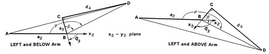 Geometric solution for joint 3 (), showing two of the possible four configurations: “LEFT and BELOW Arm” (left) and “LEFT and ABOVE Arm” (right) [3].