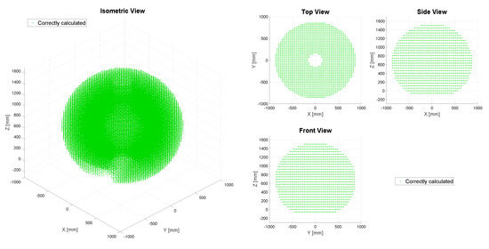 Performance analysis of the synthesized IKM for the PUMA 560. The left side shows the isometric view of the PUMA’s workspace, while the right side presents the top, side, and front views of the same workspace. Marked in green (“Correctly calculated”) are all the the positions in which the IKM obtains the same amount of solutions as the reference model, with an RMS error lesser than . The data show that all the positions of the analyzed workspace are correctly calculated.