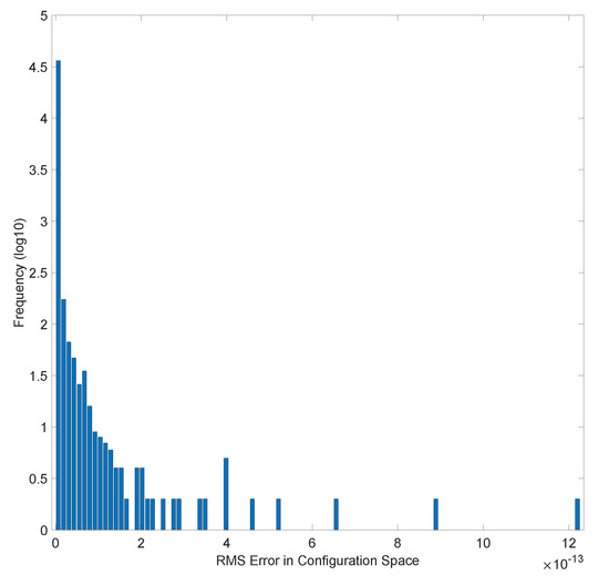 Figure 8 shows the histogram of the RMS error for all the analyzed points inside the robot’s workspace. It can be seen in this histogram that the errors for all the solutions computed by our IKM are completely negligible.