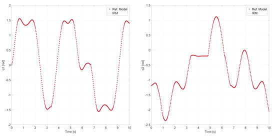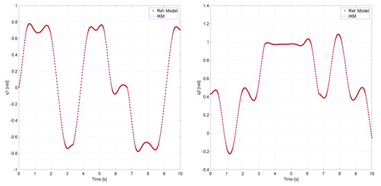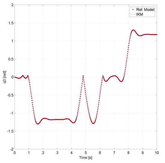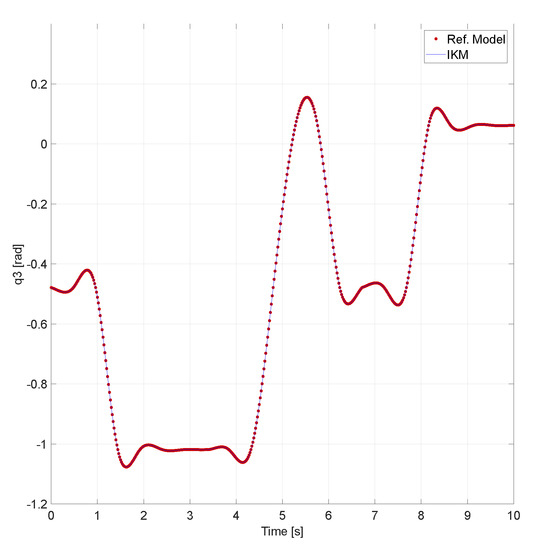 Trajectory tracking analysis for the PUMA’s IKM. The red dots represent the outputs of the reference model, for each of the PUMA’s DoFs, when it is supplied with the predetermined trajectory, while the continuous blue lines are the IKM’s outputs for that same trajectory. The upper left figure presents the computed outputs for the first DoF (), the upper right one corresponds to the second (), while the bottom figure are the ones for the third DoF (). The data show that the IKM’s outputs follow the ones of the reference model, with high accuracy and a negligible error along all the desired trajectory, in the robot’s three DoFs.
