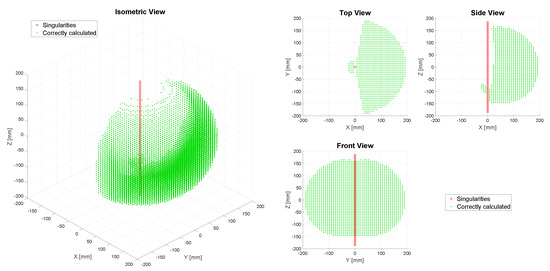 Performance analysis of the synthesized IKM for the hexapod’s leg. The left side shows the isometric view of the leg’s workspace, while the right side presents the top, side, and front views of the same workspace. Marked in green (“Correctly calculated”) are all the the positions in which the IKM obtains the same amount of solutions as the reference model, with an RMS error lesser than . The red circles correspond to the singularities of the leg’s mechanism that are correctly identified by the synthesized IKM. The data show that all the positions of the analyzed workspace are correctly calculated.