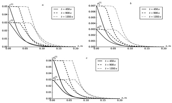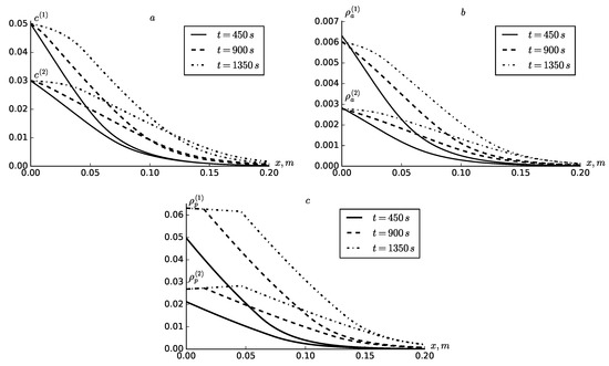 Figure 4. Profiles of c ( 1 ) , c ( 2 ) (a), ρ a ( 1 ) ρ a ( 2 ) (b), ρ p ( 1 ) ρ p ( 2 ) (c), at ρ p 1 ( 1 ) = 0.03 , ρ p 1 ( 2 ) = 0.015 , γ ( 1 ) = ω ( 1 ) = 0.01 , γ ( 2 ) = ω ( 2 ) = 0.05 , D ( 1 ) = 2.0 · 10 6 m 2 /s, D ( 2 ) = 1.5 · 10 6 m 2 /s.