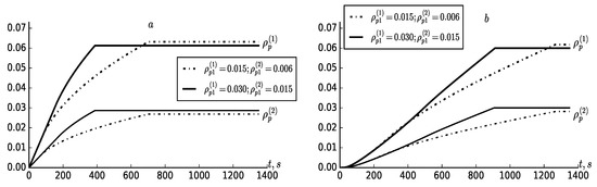 Figure 5. Dynamics of ρ p ( 1 ) and ρ p ( 2 ) at the points x = 0 m (a) and x = 0.04 m (b), at different values of ρ p 1 i .