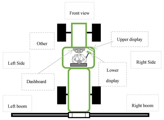 With these potential benefits, it is necessary to know which regions of the agricultural machine and its surrounding environment should be targeted by visual sensors. The authors of [14] recognized seven “look zones” (or areas the operator is expected to visually monitor during operation) for a seeding machine, labeled as: (i) forward, (ii) right side, (iii) planter, (vi) planter edge, (v) display X (located at the top right corner from the operator’s seated position), (vi) display Y (located close to the right arm rest), and (vii) other. When researching the workload associated with operating an agricultural sprayer, the authors of [15] identified four sectors: (i) field ahead, (ii) left boom, (iii) right boom, and (iv) the lightbar guidance aid. They noticed that the amount of time operators spent looking at these regions varied with (i) operator experience and (ii) the presence of navigation devices (i.e., lightbars, autosteer technology). Designers of autonomous systems have also suggested various regions of the agricultural machine that warrant observation. For example, an interface for driverless tractor seeding equipment showed the view ahead of the machine as well as the left and right sides of the seeding implement, respectively [16]. In the interface developed by [17] for monitoring multiple agricultural robots, an aerial (satellite) view of the robots in the field was included.