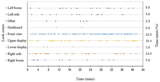 Another method for interpreting eye-tracking data is to represent the data as a function of time to give a sense of the cyclical nature of the task [14]. The data collected in this study are presented as a function of time in Figure 4. The data show that the operator was focused primarily on four look zones (front view, upper display, right side, and right boom) during the first 9 min of video footage—this corresponded to the time when he was spraying the field boundary. The front view enables the operator to assess where he is going and when to initiate turning, while the look zones to the right (i.e., right side and right boom) enable the operator to guide the sprayer along the field’s boundary. Therefore, when the operator was spraying along the field boundary, his attention was split between looking ahead and watching the right side of the sprayer. Once the field boundary was completed, the time spent viewing the right boom decreased noticeably.
