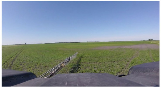 Arrangements were made to observe the operator of a high clearance, self-propelled agricultural sprayer (Rogator 1100 AGCO, Duluth, GA, USA) equipped with autosteer technology during the 2017 growing season. The participant who volunteered his sprayer and farmland for this phase of the study was a farm owner with 12 years of spraying experience who also performed custom spraying. One GoPro camera (GoPro, San Mateo, CA, USA), identified as camera M in Figure 2, was mounted on the windshield inside the sprayer’s cab to record the head and eye movement of the operator. The video was recorded on the morning of 6 July 2017 on a flat field in Rosser, MB (137 acres in size), for approximately 42 min of spraying time (this was the time taken to cover the entire field). During the spraying operation, the field boundaries were first sprayed in an anti-clockwise direction (to give room for the sprayer to turn easily without going outside the field), before straight parallel swaths were completed to traverse the remaining (unsprayed) area of the field. Subsequent analysis of the video footage from camera M was performed to identify the various look zones from the operator’s perspective as described by [14]. One of the co-authors rode along with the sprayer operator to ask questions (i) about the reasons for viewing the various look zones and (ii) the type of information being acquired when viewing the look zones. Although we asked questions during the actual spraying operation rather than interviewing the operator after data analysis had been completed as suggested by [14], this is an important complementary component of the experimental methodology.