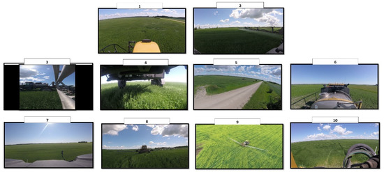 Nine GoPro cameras (Hero Session, with horizontal field of view of 120° and a video resolution of 1920 × 1440) were mounted at different locations on a high clearance, self-propelled agricultural sprayer (Rogator 1100) to capture video footage of various regions of the sprayer and its environment while the sprayer was in operation (Figure 2). Various literature sources [14,15,17] were consulted to position the GoPro cameras on the sprayer. The rationale for the positioning of each camera is provided in Table 1. Some cameras were positioned to provide familiar views (i.e., look zones that a sprayer operator would typically see from the seated position), while other cameras were positioned to provide non-traditional views (i.e., look zones that are not visible from the seated position). Video recording was completed on the morning of 6 July 2017 on a flat field near Rosser, MB (137 acres in size). Video duration was approximately 42 min (which was the time required to spray the entire field). On a separate occasion (21 July 2017), video was recorded from a drone to provide an overhead view of the entire sprayer. A third party licensed drone operator assisted in capturing the overhead view on a field near Moosehorn, MB (120 acres in size); video was recorded for approximately 11 min and covered only a portion of the spraying operation.