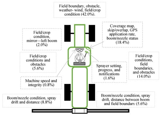 Furthermore, environmental cues were considered important by participants when such cues were presented in relation to the spraying operation. For example, a higher number of participants perceived the field boundary to be valuable information when the end of the boom was visible with respect to the field boundary. However, fewer participants perceived the “field boundary” to be useful in clips that didn’t relate it to the spraying operation (boom), despite being visible. In other words, the field boundary is only important with respect to the position of the sprayer—the user does not care about the location of the field boundary unless it is presented in relation to the position of the boom. A summary of the information gained by operators based their look zones is presented in Figure 8.