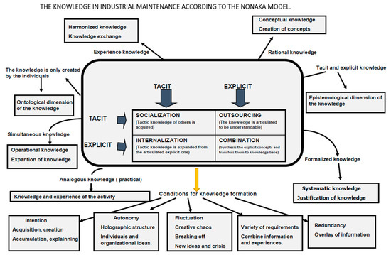 There are many studies on knowledge management in different industrial and service activities, and the effect on their application, but usually such studies focus on global management (especially the most explicit part of the work), influencing trade, internal or accounting administrative management, R&D or development activities, information technology companies (IT), etc. [23,24,25,26,27], but sparsely on the tactical actions of industrial trades such as maintenance engineering. The maintenance activity, as it is organized and due to its own specificity, fundamentally generates tacit knowledge based on experience, at levels much higher than are explicit, which is also recorded in a fragmented way. In general, there are mature workers, with a lot of experience due to the great specialization required and, in addition, a type of information is created that is not elaborate and weakly oriented to decision-making [2]. That is why managing knowledge in these areas of work implies, in itself, not only an improvement in the efficiency of the processes of the industrial internal trades, but also a reduction in expenses induced by the company itself (production stops, loss of energy efficiency, loss of reliability of systems and facilities and longer learning time for new technicians).