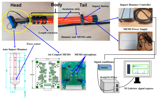 Commonly employed FRF tests are performed by attaching an accelerometer to the structure and striking the measurer with an impact hammer by the user. However, due to the inaccessibility of the porcelain insulator owing to the field conditions in which high voltages pass, it is necessary to develop suitable equipment that can measure over long-distance ranges according to basic operating principles. The device developed in this study is shown in Figure 2. The developed device is divided into three parts: the head, including the auto impact hammer and signal receiver; the body, made to extend the length of the insulating material; and the tail, consisting of the impact button and handle. It also includes a controller that can adjust the impact strength of the auto impact hammer and a device for power supply. The auto impact hammer (330AE-05) in the head region, manufactured by AISYSTEMS Ltd. in Korea, can control the impact strength up to 100 N, and includes a force sensor to measure the input energy during striking. The MEMS microphone (Zero-Height SiSonicTM Microphone) was manufactured by KNOWLES Ltd. in USA, and reduces weight for user convenience in the signal receiver. The contactless MEMS microphone was used in consideration of field situations where direct contact is difficult [28]. Four sensors are used to reduce data measurement errors and ensure data reliability, and the frequency range of the sensors is 0 to 80 kHz. The insulation stick of the body part is made to extend up to 5 m.