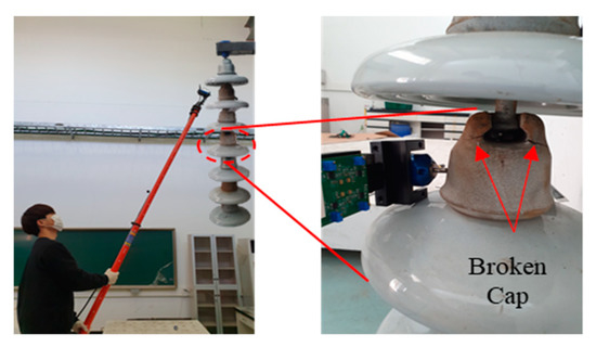 Most techniques for detecting damage to an insulator focus on checking the insulation performance of the insulator from an electrical standpoint. Commonly used contact inspection methods in the field include the HI-Pot test, partial discharge measurement method, electric field measurement method, and insulation resistance measurement method [7,8,9,10]. In addition, recently, non-contact infrared scanning and image analysis methods for measuring mechanical damage from a long distance have been studied [11,12]. However, for the above measurement method, even if there is no physical damage, these values vary depending on the temperature, humidity, and chloride content of the atmosphere. In addition, the existing methods cannot be effective in identifying the damage of the insulator due to insensitivity to internal and external physical damage, as presented in Figure 1. In particular, internal cap defects and interfacial damage are difficult to find with visual inspection so a method of overcoming this is necessary.