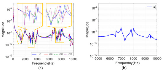 First, analysis was carried out to determine whether the normal and damaged caps were distinguishable for the cristobalite material. The FRF of the normal specimen (C) produced four eigenmodes from 0 to 5 kHz and four eigenmodes from 5 to 10 kHz, as shown in Figure 4a,b. Similar waveforms appeared in other normal specimens, and it was confirmed that no peak other than those of the eight eigenmodes occurred. In the case of cap damage specimens (CD1 to CD3), a new eigenmode was generated below 2 kHz, and the second eigenmode was characterized by low frequency shift. However, the FRF waveform was mostly normal. Differences between the normal and damaged cap specimens have typically been identified by striking porcelain samples, but these minor changes can be difficult to replicate due to the characteristics of porcelain insulators in various manufacturing conditions, and the errors in field experiments. Therefore, the analysis was conducted by striking the cap to derive a clear difference between the normal condition and cap failure.