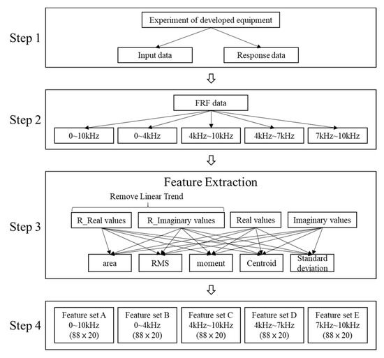 Feature extraction proceeded from step 1 to step 4 as shown in Figure 7. First, in step 1, the FRFs were tested for all porcelain insulators using the developed equipment of Figure 3, and input data and response data were collected. The input data is a signal collected from the auto impact hammer, and output data is a signal collected by the MEMS microphone. In step 2, the input data and response data were converted into the frequency domain by FFT, and the FRF data of each porcelain insulator were calculated using Equation (1). Then, each set of FRF data was extracted separately according to the five frequency ranges identified in Figure 6. In step 3, a total of four basic data sets were constructed, including the real and imaginary values of the FRF data and the data not exhibiting a linear trend between the two values. The original data of the FRF waveform has real and imaginary values, which means that a total of four basic data sets for one FRF waveform are constructed. Next, 20 characteristics were derived by calculating area, root mean square (RMS), cross-sectional primary moment, center, and standard deviation using the four basic data sets [29]. Removal of trends implies subtracting the mean or the best fit line from the data (meaning the least squares). Removing the trends from the data allows us to focus our analysis on variations in the data for the trends. Linear trends generally indicate a systematic increase or decrease in data. Trends are meaningful, but removing trends provides better insights in some analysis types. Whether it is appropriate to remove trend effects from the data often depends on the analytical goal. Finally, in step 4, the data calculated according to the frequency range is divided into feature sets A to E and then used as basic data for NCA analysis.