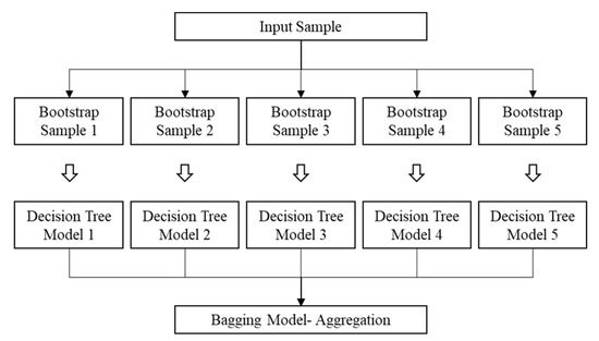Bagging, also called bootstrap aggregating, is an ensemble method. It is a meta-algorithm used to improve the stability and accuracy of the ML algorithms employed in classification and regression. It also helps to reduce variance and avoid overfitting, and is generally applied to decision tree methods but can be used with any type of method. The bagging method proceeds according to the procedure depicted in Figure 8 [22,23]. In general, in case of categorical data, the predictor is counted by voting, and in case of continuous data, it is counted by the average. In this study, voting was used because the data is categorical.